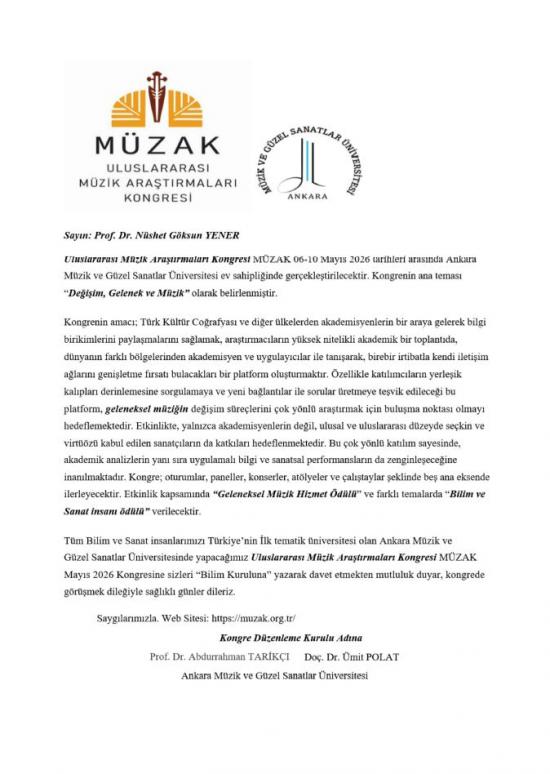 Dekanımız Prof. Dr. N. Göksun YENER, Ankara Müzik ve Güzel Sanatlar Üniversitesi Uluslararası Müzik Araştırmaları Kongresi MÜZAK’ın Mayıs 2026 Kongresi “Bilim Kurulu”na seçildi.