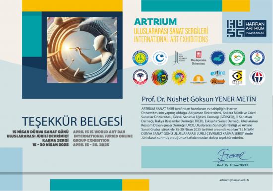 Dekanımız Sayın Prof. Dr. Göksun YENER Artrium Uluslararası Sanat Sergisinde ARTRIUM SANAT EKIBI tarafından hazırlanan ev sahipligini Harran Üniversitesi’nin yapmış olduğu 15-30 Nisan 2025 tarihleri arasında yapılan “15 NISAN DÜNYA SANAT GÜNÜ ULUSLARARASI JÜRILI ÇEVRIMIÇI KARMA SERGI” sinde Jüri Olarak Görev Aldı.