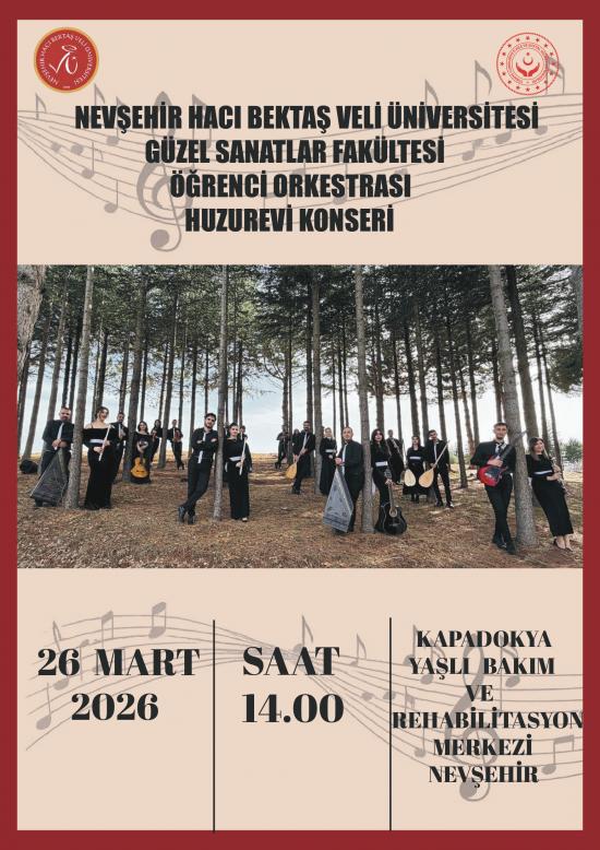 Nevşehir Hacı Bektaş Veli Üniversitesi Güzel Sanatlar Fakültesi Sahne Sanatları Bölümü/Müzik Ana Sanat Dalı tarafından yapılacak olan etkinlikte ‘Güzel Sanatlar Fakültesi Öğrenci Orkestrası’ sahne alacaktır.