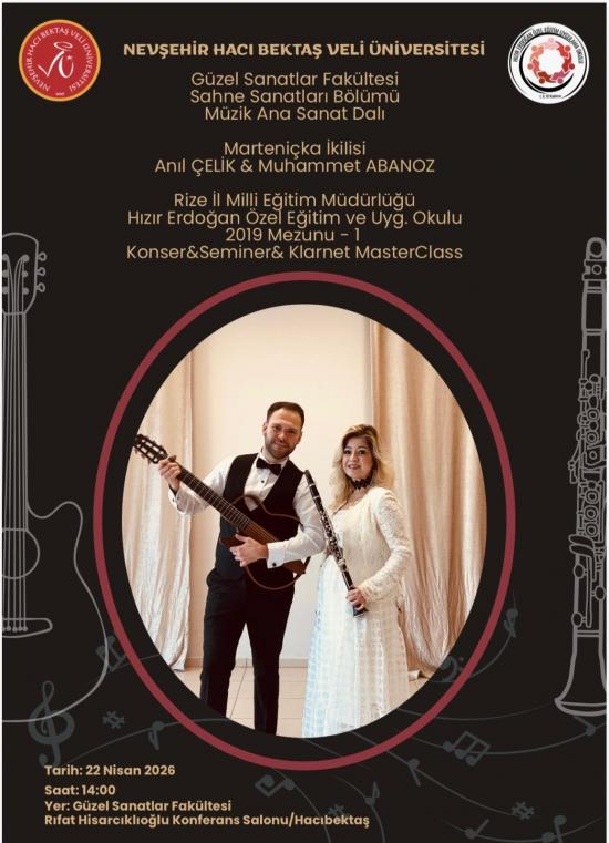Nevşehir Hacı Bektaş Veli Üniversitesi Güzel Sanatlar Fakültesi Sahne Sanatları Bölümü Müzik Ana Sanat Dalı Klarnet Sanatçısı Doç. Anıl ÇELİK ve Güzel Sanatlar Fakültesi Sahne Sanatları Bölümü Müzik Ana Sanat Dalı 2019 Mezunu Sayın Muhammet ABANOZ Rize İl Milli Eğitim Müdürlüğü Hızır Erdoğan Özel Eğitim ve Uygulama Okulu ve Güzel Sanatlar Fakültesi Sahne Sanatları Bölümü Müzik Ana Sanat Dalı işbirliği ile gerçekleştirilecek olan “Konser & Seminer ve Clarinet Masterclass” etkinlikleri düzenlenecektir.